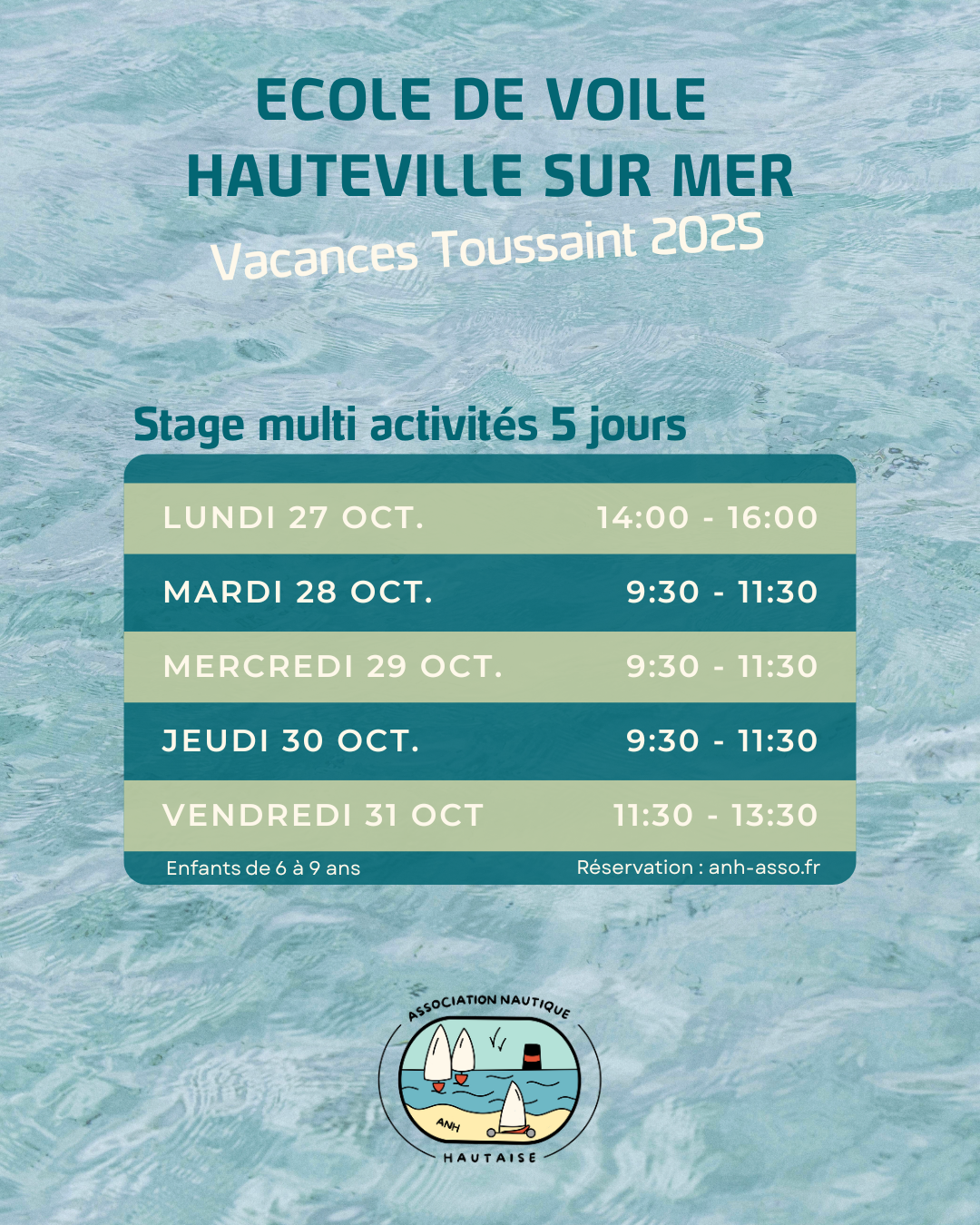 Du mardi au jeudi, 2h par jour, en juillet et aout. Initiation aux activités nautiques : voile, char à voile, paddle, kayak, chasse au trésor, pêche à pied... L'activité est choisie en fonction de la météo, de la marée et des enfants présents. Chaussons ou baskets obligatoires — Aisance aquatique. Location combinaison possible. Réservation en ligne